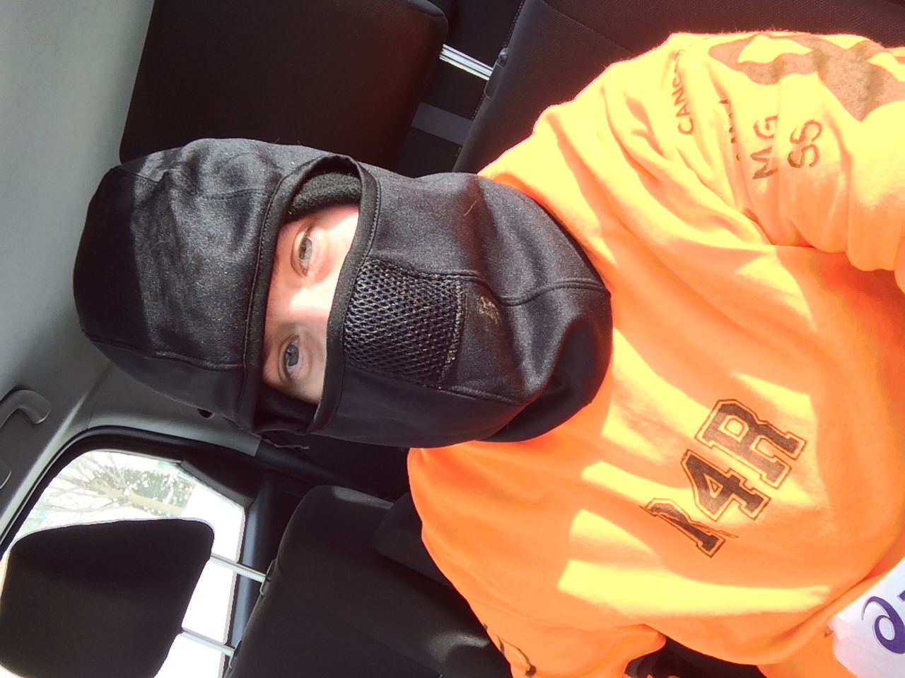 I wasn’t too concerned about the temps because I knew I would have enough layers on, but the picture above shows you just how prepared I was for today. I’ve only worn that full face hat twice, including today, and boy was it necessary. I started walking to the start line without it on, but turned back as my cheeks were getting just bitter cold. Mid race I took it off because I was so warm, but it still came in handy at the end because once I slowed down I was once again cold.